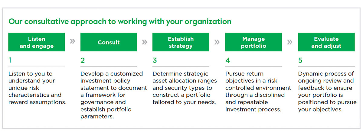 For this reason, an often-overlooked benefit of working with an institutional asset management firm is that they can provide consulting services to your board of directors, connecting your management team with subject matter experts who can provide guidance and clarity on complicated financial management issues.