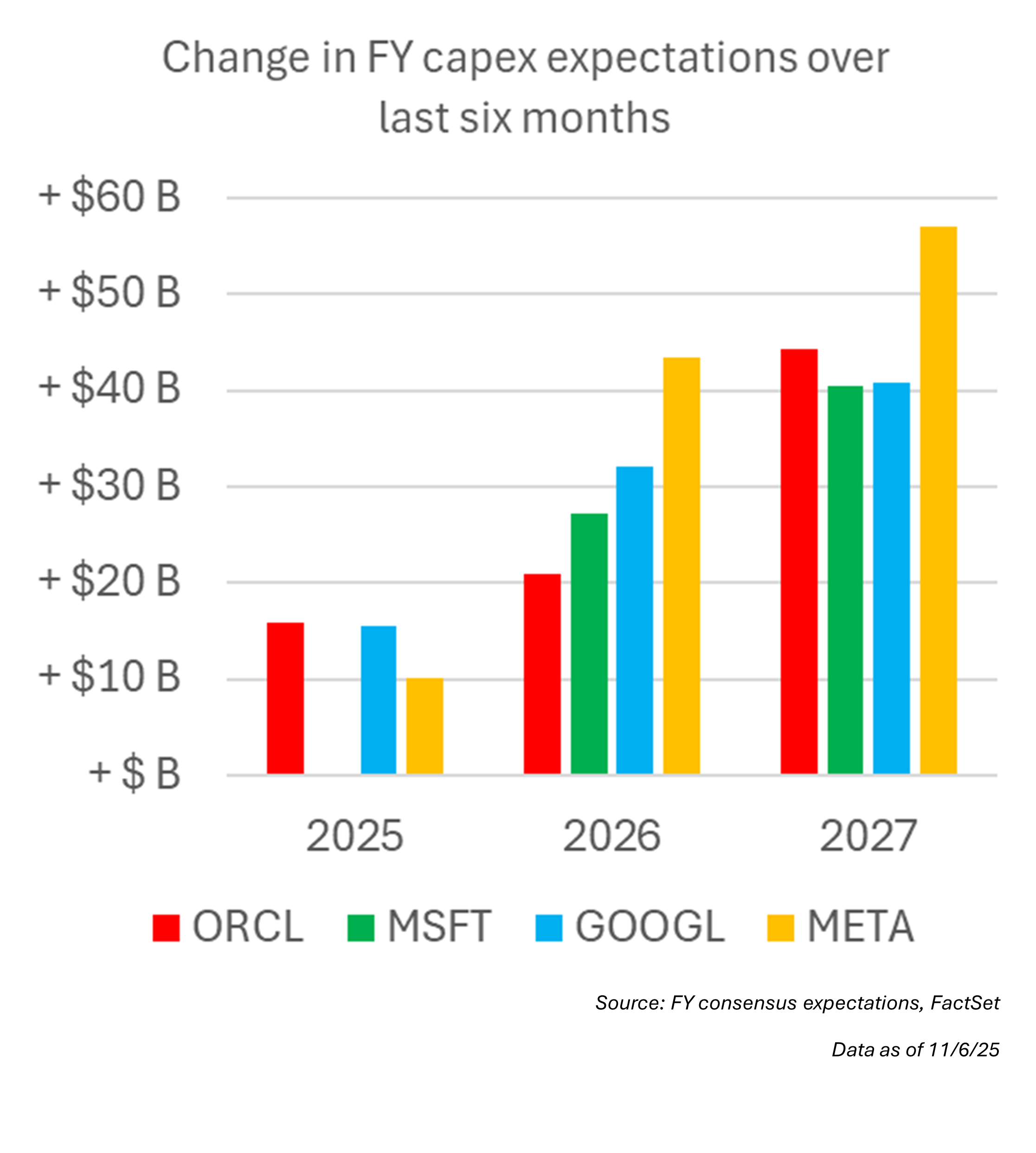 Mega-cap tech companies with more traditional public cloud businesses led a majority of the initial AI spending boom. However, much of the rise in spending expectations is being driven by a different set of tech companies. And while spending expectations continue to increase at the likes of Microsoft (MSFT) and Alphabet (GOOGL), they are rising far more quickly at companies like Meta (META) and Oracle (ORCL).