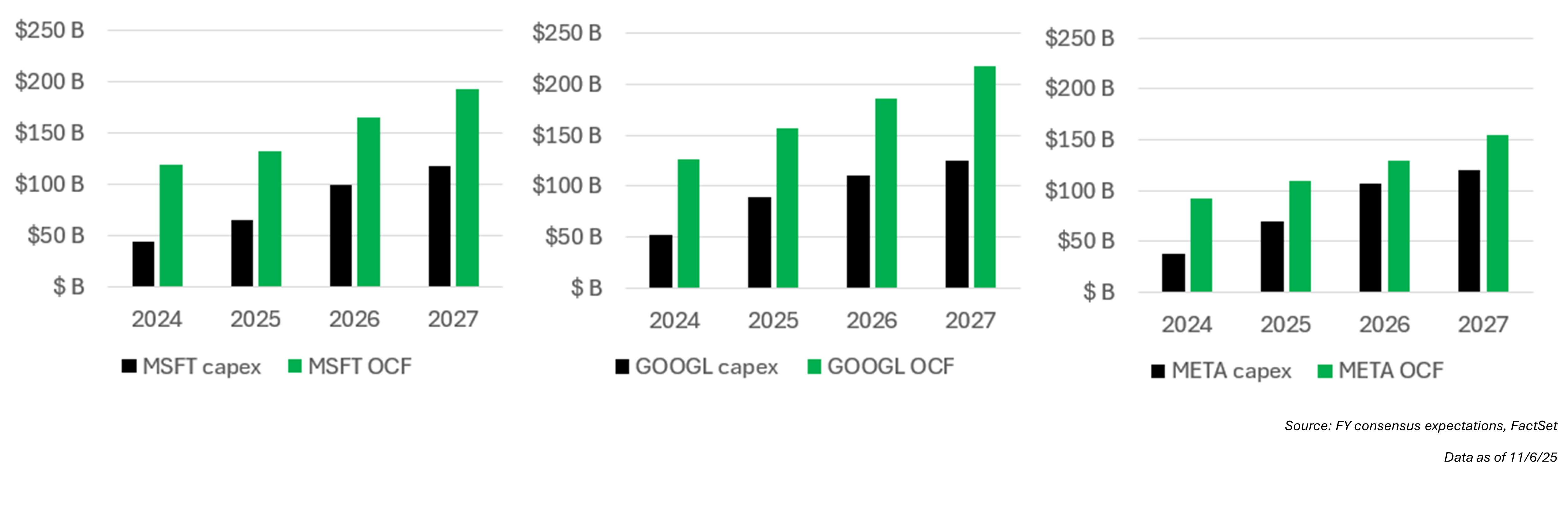 Since the beginning of 2023, our internal research teams have found that the growing demand for AI hardware has primarily come from companies with meaningful cash on their balance sheets and robust operating cash flow (OCF) profiles like Microsoft (MSFT), Google (GOOGL) and Meta (META). As these companies move to increase their AI spending even further, their strong OCF profile can continue to support.