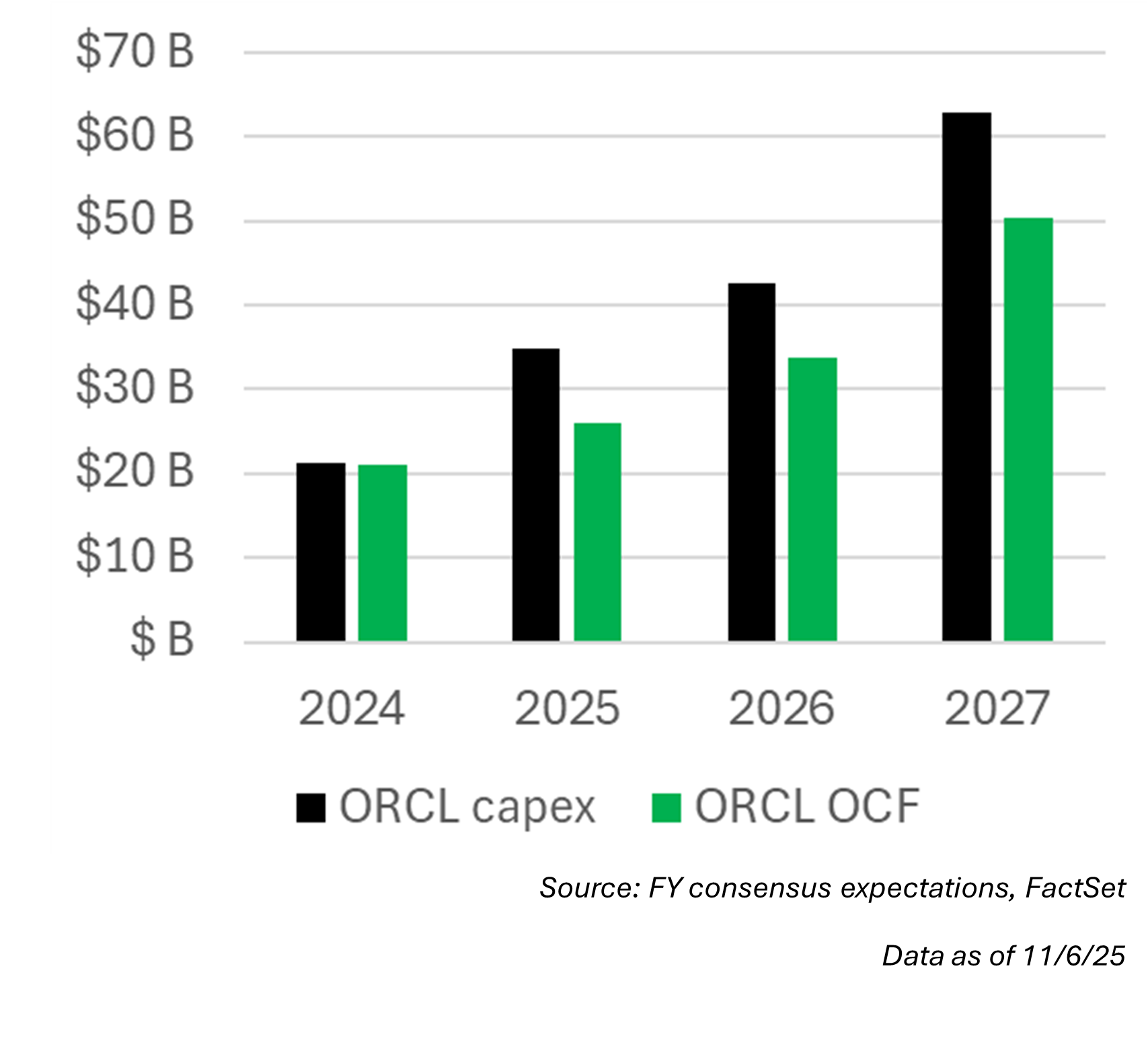 - Oracle’s (ORCL) FY2027 capex expectations have increased by a staggering 239%, from $19B to $63B, as the company reinvents itself as a provider of AI computing.